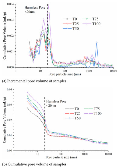 Figure 9 shows the effect of TS dosage on the micro-pore structure of UHPC after curing. The pore particle sizes of all of the mixtures were mainly within the range 19.93–23.41 nm (Figure 9a). According to a previous study, pores with a diameter of smaller than 20 nm can be considered harmless pores [45]. Thus, we concluded that the pores do not adversely affect the strength of UHPC and that the incorporation of TS does not harm the pore structure of UHPC.