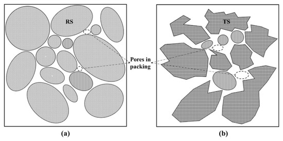 (b) the different shape between two aggregate also influenced dramatically the packing model of UHPC. Ostrowski et al. discussed the morphology of aggregate on the properties of HPC (high-performance concrete), of which the result is similar to that of this study [46,47]. Elliptical shape of RS (Figure 4b) makes the particles compact close, and the smaller particles can effectively fill the holes between the larger particles (Figure 10a). This close contact and filling effect between aggregates can make the packing model more compact and reduce number and size of pores. Nevertheless, compared with RS, TS is much more angular and presents the shape of concave polyhedron (Figure 4a). This shape feature prevents the aggregate from contacting closely with each other (Figure 10b), leading to the increase of porosity [46]. At the same time, the angular shape of TS has a poor filling effect between particles, which also deteriorates the packing model and internal pore structure.
