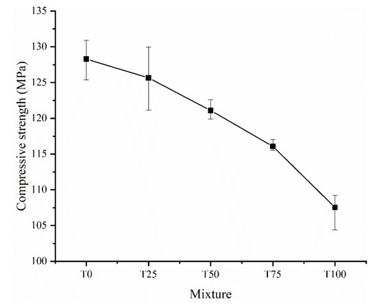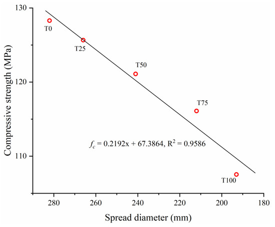 Figure 11 shows the compressive strengths of the UHPC samples with different TS contents after curing. With increasing TS content, the compressive strength of the UHPC decreased by 2.05%. 5.61%, 9.50%, and 16.17%, respectively, and the magnitude of the decrease increased with TS content. As reported in previous studies [29,48], due to the finer particle size compared with river or silicon sand, iron tailing in concrete mainly played an actor as filling material, which can slightly enhance the compressive strength due to the much denser structure. However, in this study the particle size of two aggregates are similar. Hence, the filling effect is negligible. As shown in Table 2, although the particle strength of Tailing Sand is slightly higher than that of River Sand, the compressive strength of specimen with TS is still low (especially T100). The reduction of compressive strength can be mainly due to the loss of workability. As discussed in Section 3.1 and testing result in Figure 7, with the increasing replacement of TS, the spread flow diameter (i.e., workability) of slurry decreases sharply. At the same time, the low workability obviously affects the mechanical behavior of hardened UHPC. Figure 12 shows the relationship between the spread diameter (i.e., workability) and compressive strength of UHPC with different TS content. It is obvious that there is a strong correlation between workability and compressive strength. With the increasing content of TS, the workability sharply decreased, finally leading to the loss of compressive strength. On the other hand, the increase of air bubbles (Figure 8) makes the internal structure of UHPC more porous and has an adverse effect on the compressive strength at the same time.