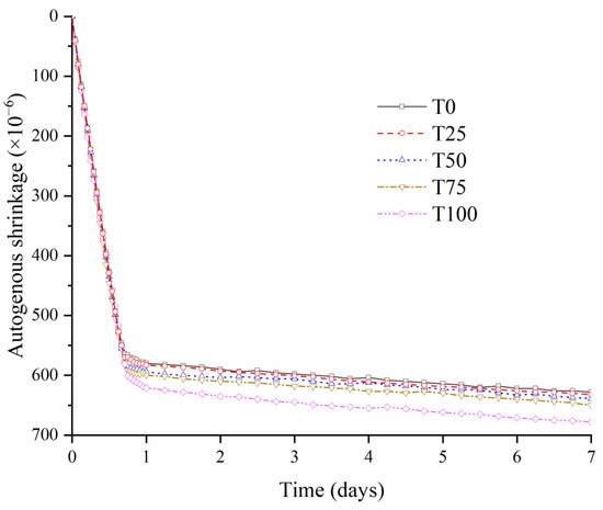 Autogenous shrinkage is a critical factor that affects the mechanical properties and durability of other cement-based materials. Compared with other cement-based concrete, UHPC exhibits greater early autogenous shrinkage due to the low w/b ratio and the substantial amount of binder, which may cause a high internal stress and lead to the generation of microcrack significantly [49,50,51]. Figure 13 shows the effect of TS content on the autogenous shrinkage of UHPC. All specimens show a similar trend in which shrinkage occurs mainly within 1 d, consistent with the previous study [51]. Compared with the reference UHPC sample T0, all the mixtures with TS have a greater 7 d autogenous shrinkage, where the shrinkage increases by 0.63%, 1.75%, 3.50%, and 7.96% for T25, T50, T75, and T100, respectively. This increase of shrinkage value can be explained as that TS absorbs much more water than RS due to the much larger water absorption ratio. According to previous studies, the water-absorption characteristics of aggregates affect the autogenous shrinkage of concrete and a higher water-absorption ratio results in greater autogenous shrinkage [22,52]. The iron ore tailings absorb most free water in the early stage, which leads to the decrease of the internal pressure and the increase of the shrinkage finally. Previous study has also indicated that a finer aggregate particles size increases the autogenous shrinkage of concrete [53]. Although the particle size range of TS is similar to that of natural river sand, considering the complex surface morphology of TS (shown in Figure 4), the shape of tailing sand could be imagined as a finer particle with irregular-shape granule cover. This makes the particle size of tailing sand lower than that of natural river sand, which also has a promoting on the autogenous shrinkage.
