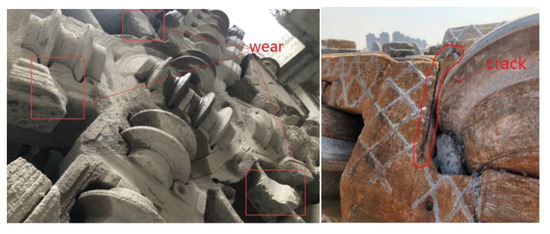 The working principle of a cutterhead is as follows: the cutterhead breaks and cuts the soil using the cutters installed on the panel with the comprehensive action of thrust and torque; the tunnel section is formed once. Generally, the cutterhead of a shield machine is welded by carbon-dioxide gas shielded welding, and an ultrasonic testing method is used for flaw detection, with the highest accuracy being Φ2 mm. Due to the extremely complex geological conditions in the process of cutterhead excavation, cracks will be initiated and propagated in small defects or weak links by the action of alternating loads, which can result in structural failure. The wear and fatigue cracks are the main forms of cutterhead failure, as shown in Figure 2.