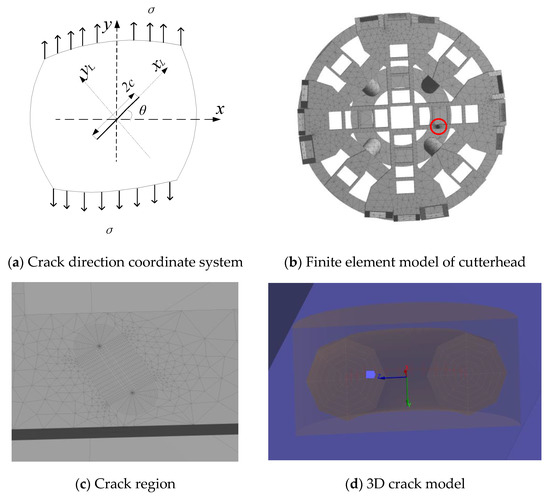 Definition of crack position angle: (a) Crack direction coordinate system (b) Finite element model of the cutterhead (c) Crack region (d) 3D crack model.