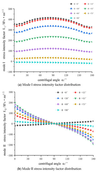 As shown in Figure 7, crack stress intensity factors of different crack centrifugal angles under different crack position angles are presented.