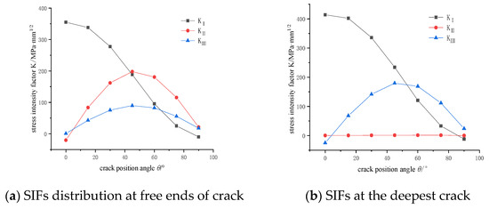Stress intensity factor distribution of cracks: (a) SIFs distribution at free ends of crack (b) SIFs at the deepest crack.