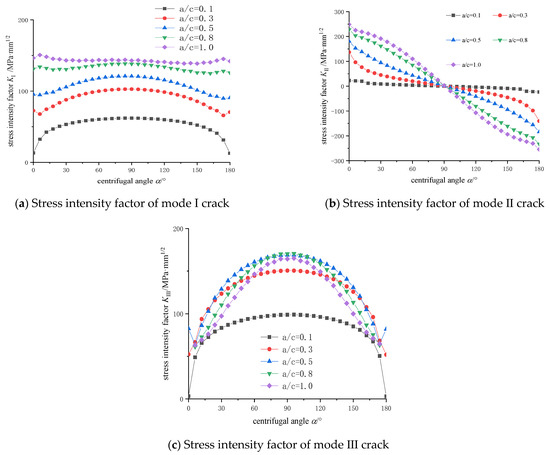 - The stress intensity factors of mode I crack are basically symmetrical, and range from 50 to 150 MPa·mm1/2. With the increase of the crack shape ratio, the values of stress intensity factors increase gradually. When the crack is very shallow, the main propagation is depth growth, the length growth is secondary; when the crack approaches circular (a/c = 1.0), the stress intensity factor of crack is basically linear.