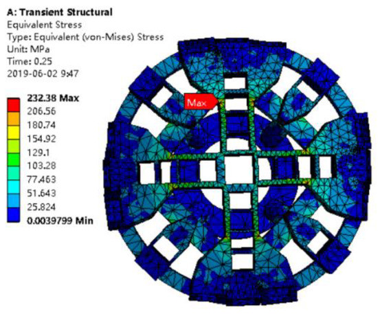 In Formula (4), the crack shape coefficient α is 1.1. In reference [20], the safety factor s1 is 2 and the Q345 fracture toughness value KIC is 203.08 MPa·m1/2. As seen in Figure 10, the maximum stress σmax is 232.38 MPa. When introducing the above values into Equation (4), the damage tolerance value of the cutterhead crack depth direction can be obtained as follows: