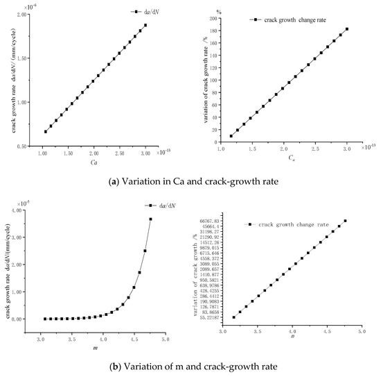 The crack propagates in both depth and length directions. According to Formula (5), the partial derivatives of Ca and m are calculated, respectively, and the effect of the partial derivatives on the crack-growth rate is investigated. As shown in Figure 11, taking m = 4.0 and ΔKeqa = 50 MPa·mm1/2, and the rate increases linearly with Ca and exponentially with m. When m less than 4.0, the rate changes relatively gently. The crack-growth rate increases rapidly with m increasing when m is bigger than 4.0. When the stress intensity factors of the crack ranges are in the same interval, the depth growth rate is larger than the length expansion rate. It is recommended that C should be less than 2 × 10−13 and m should be less than 4.0, which tends to be safe.