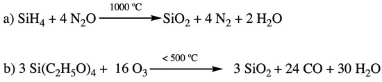 The SiO2 was initially deposited by a plasma-enhanced chemical vapor deposition (PECVD) technique with silane (SiH4) and N2O as precursors [2] (Figure 1a). The main disadvantage with this deposition method is the high fabrication temperature (usually up to 1000 °C) during integration. Such temperatures can easily disintegrate some of the previously deposited layers. Therefore, attempts were made to develop different chemistries and precursors to lower the temperature of the PECVD process [3]. Silicon alkoxide precursors soon had attracted people’s attention. The iconic ones include branched and cyclic silicon alkoxide such as tetraethylorthosilicate (TEOS) [4,5] and tetramethylcyclotetrasiloxane (TOMCATS®) [6]. They were used as alternative precursors for silane (SiH4) to lower the processing temperature (less than 500 °C) required for SiO2 deposition [2]. The reaction of silicon dioxide layer deposition with TEOS precursor is shown in Figure 1b. However, as the IC size shrunk to sub 180 nm dimension with the dielectric constant requirement of less than 3.0, silicon dioxide was destined to be replaced by other novel low-k materials, as shown in Table 1.
