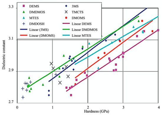 The fabrication of silica-based ILDs requires a high concentration of Si–C bonds within their matrix. Therefore, precursors with one or more Si–C bonds were developed to meet such requirements. During the CVD step, these precursors are incorporated, with a certain ratio of oxidant precursors (such as O2, O3, N2O, or NO), under an inert gas atmosphere to create a layer of low-k thin film containing Si–C, Si–O, and Si–H bonds. It is also possible to combine alkyl siloxane precursors with oxidant precursors together and create a single precursor that has all the required components. One important factor that should be noted is that all of the atoms being introduced into the CVD chamber are important during the CVD process. Therefore, it is important to choose precursors with only Si, O, N, and H atoms. Here are some of the iconic examples of SiCOH precursors, diethoxymethylsilane (DEMS) [16,17], methyltriethoxysilane (MTES) [18], dimethoxymethylsilane (DMOMS), tetramethylcyclotetrasiloxane (TMCTS or TOMCATS®), octamethylcyclotetrasiloxane (OMCTS), dimethyldioxosilycyclohexane (DMDOSH), dimethyldimethoxysilane (DMDMOS) [19], and trimethylsilane (3MS) [20,21]. Table 2 shows molar ratios of Si–C, Si–O, and Si–H bonds with a silicon atom within each precursor molecule, respectively. The hardness and dielectric constant of the final ILDs corresponding to these precursors is shown in Figure 3 [2]. According to Figure 3, DEMS shows an excellent dielectric constant and hardness over other precursors. In 2003, Vincent et al. fabricated a dielectric layer with a DEMS precursor, demonstrating a Young’s modulus of 16.5 GPa and hardness of 2.8 GPa, while that based on 3MS and DMDMOS only showed a Young’s modulus of 8.76 GPa and hardness of 1.44 GPa, and Young’s modulus of 6.68 GPa and hardness of 1.2 GPa, respectively (Table 3) [22]. Besides DEMS, ring-structured DMDOSH also gained a lot of interest in mechanical strength enhancement. The ring-opening of such a structure may facilitate crosslinking during the CVD processes [22] (Figure 4). In theory, any volatile molecule (boiling point below about 250 °C) containing silicon and organic groups can be used as a SiCOH precursor. Vincent et al. systematically summarized some of the iconic organosilicon precursors in his patent [22]. For the semiconductor industry, finding a suitable alkyl siloxane precursor requires the ability for film formation to have good electrical and mechanical properties, as well as commercial availability or low cost to manufacture.