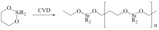 The semiconductor industry constantly demands ultra-low-k materials (k < 2.6). Any further reduction of the k value would require introducing a pore structure into the dielectric material. Such pore structures can be obtained by either constitutive or subtractive methods [23,24,25]. Constitutive porosity, according to the International Union of Pure and Applied Chemistry (IUPAC) nomenclature, refers to pores created during deposition of an ILD without any post-fabrication treatment, and the pore structure depends on the original, as-deposited arrangement. Both SSQ and silica-based ILDs can have constitutive porosity. The pores are created mainly from the arrangement of atoms during the CVD step, which will be covered in later sections. Subtractive porosity involves the selective removal of part of the material from prefabricated films. In other words, subtractive porosity is created by incorporating an additional porogen precursor during the deposition process. The porogen precursors are hydrocarbons containing at least one alkene, alkyne, strained epoxy group, or carbonyl functional group. Porogen precursors will eventually be removed during the post-deposition-curing process [26,27]. The curing process can be done either thermally [28] or using an electron beam or ultraviolet radiation [29,30]. Some SiCOH precursors can even have built-in organic porogens. The reactive functional groups within precursors can readily generate radicals under plasma conditions, which may aid the incorporation of organic phases into the matrix. Nguyen et al. and Vincent et al. have systematically categorized the most common SiCOH precursors with embedded porogen organic groups in their patents [22,31]. Table 4 shows some of the most iconic SiCOH precursors with build-in organic porogens. The main difference between precursors shown in Table 2 and Table 4 is that these organosilicon precursors have one or more porogen functional groups.