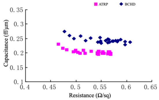 The industry has adopted α-terpinene (ATRP) [37] and bicycloheptadiene (BCHD) [38] as sacrificial porogens [27,29]. Both porogens have been successfully incorporated into a 28 nm technology node for pULK film manufacturing, with dielectric constants ranging from 2.4–2.6. Ming et al. reported a comparative study between porous thin films deposited with DEMS using ATRP and BCHD as porogens (Table 7). The data suggested that the hardness, Young’s modulus, and interfacial adhesion of the pULK film deposited with the ATRP porogen were 1.0 GPa, 7.1 GPa, and 5.9 J/m2, respectively, which were slightly higher than that deposited with BCHD (0.7 GPa, 5.1 GPa, and 5.4 J/m2). However, the pULK film fabricated with ATRP showed a slightly higher dielectric constant; the post-integration resistance-capacitance (RC) test results indicated that the k recovery effect of the ILD from the ATRP was better than that from the BCHD precursor. Figure 5 shows the RC curves of the post-integration pULK films from the ATRP and BCHD precursors, respectively. The pULK film from BCHD has a higher capacitance at the same resistance level compared to that from the ATRP precursor, indicating that the BCHD ILD was likely damaged by the plasma process during post-deposition integration [25].