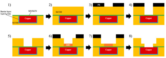 Plasma technology has been very prevalent in micro-electronic manufacturing processes, including cleaning, surface treatment, dielectric etching, metal barrier deposition, and metal deposition [11]. One important point is that these are post-fabrication plasma treatments, which are not part of the thin film fabrication process. The degradation of porous ILDs caused by the plasma-related treatment is known as Plasma-Induced Damage (PID). Compared to crystalline silicon dioxide, pULK materials’ spongy nature has made them mechanically weak, thermally unstable, and hydrophilic. To better understand where PIDs come from, it is necessary to know the basic integration process known as the dual-damascene process. The first task is to incorporate copper into the system. The IC industries replaced aluminum wiring with a lower resistance copper to minimize the resistance-capacitance (RC) delay of transistors [54,55]. The replacement of aluminum introduced more complications on the damascene process because copper is not suitable for reactive ion etching due to the low volatile by-products that can diffuse into the pores from the ILDs. To solve this problem, a Cu barrier layer, usually TiN [56], TaN, or Ta, is deposited onto the surface of the dielectric layer prior to the deposition of copper (blue portion in Figure 9). The Cu barrier layer is deposited by physical vapor deposition (PVD) with sputtering enhanced by plasma. After this step, a Cu seed layer is also deposited with the same method, followed by electrochemical plating (ECP) of Cu [57,58]. After Cu deposition, chemical mechanical polishing (CMP) was performed on top to grind down the extra portion of Cu and expose the porous dielectric layer [59,60]. An NH3 or H2 plasma clean is performed to remove copper oxides prior to the deposition of the cap layer for adhesion improvement [61,62]. Both of these steps can cause PID on the pULK layer. Another pULK layer will be deposited on top of the cap layer for the subsequent patterning of the copper wire. O2 plasma is widely used during the photoresist (PR) patterning process, and the presence of oxygen radicals can easily damage the low-k dielectric film’s surface. To limit the PID from this process, H2 can also be used as an alternative plasma gas to replace O2 [63,64]. After the removal of the photoresist layer, an anti-reflective coating (ARC) material is filled in the gap between dielectric layers with the spin-on method to protect the silicon nitride layer. This material can later be removed as a part of the photoresist stripping process [65]. The deposition cycle can be repeated for multi-layer fabrications.