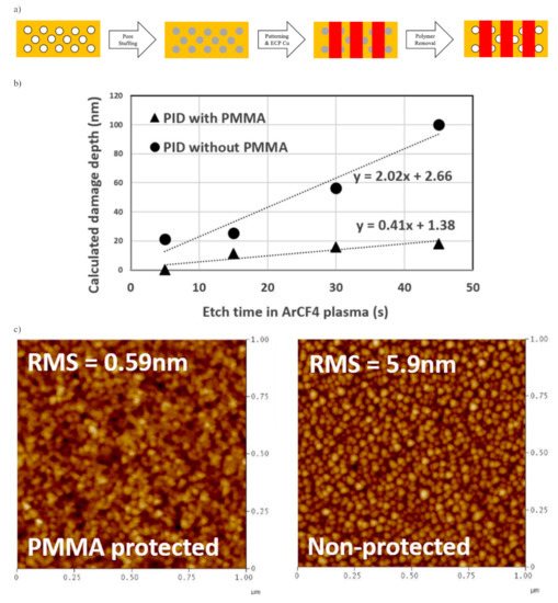 Though a highly porous structure could be obtained after PECVD, too many pores can also be problematic. First, the copper substrate, unlike the older generation Al substrates, tends to diffuse inside the pores, causing the ILDs’ dielectric constant to rise. Furthermore, as pore size gets larger, the film tends to trap moisture inside pores leading to higher conductivity. Furthermore, during the ECP of Cu, atoms will also inevitably diffuse inside pores on the ILDs’ surface and compromise their dielectric properties. The copper barrier layer and etching stop layer from previous sections are the two types of dense protection layers for stopping atom-diffusion. The atomic layer deposition (ALD) of tantalum or titanium-based materials, such as Ta and TaN or TiN, was considered as one of the most promising ways to stop metallic diffusion [8]. Yet, the gaseous TaN during ALD deposition of such materials can penetrate into the pores on the dielectric surface as well, which compromises the conductivity of the previously fabricated ILDs. One promising way to stop such undesirable penetration is sealing pores from the surface region to create a dense “skin layer”. According to Puyrenier et al., the composition of such a layer can be varied by different plasma treatments: He, NH3/N2, etch + ash, or NH3 plasma treatment [9]. Specifically, NH3 plasma treatment induces a thin top layer with the lowest permeability coefficient; thus, this plasma is the most efficient for surface pore sealing (Table 8). In 2007, Peng and coworkers successfully applied NH3 plasma treatment on MSQ porous ILD to create a very thin SiCN layer (~10 nm) with little damage to the ~300 nm thick pULK film. They achieved the best results in terms of mechanical strength and anti-diffusion properties at 300 °C for 10 s. The depth/thickness of the sealed layer is dependent on the temperature and duration of the plasma treatment [10]. Besides NH3 plasma treatment, post porosity plasma protection (P4) or pore stuffing has also gained a lot of attention during recent years. The filling materials are proprietary methacrylate-based copolymers such as poly(methyl methacrylate) (PMMA) [66]. The schematic description of the P4 process is shown in Figure 11a. A layer of pULK film is initially deposited on a substrate with the PECVD method. After fabrication, a CO2 plasma treatment is used to activate the low-k surface and avoid polymer de-wetting. The PMMA polymer would be spin-coated on the top surface of the dielectric layer. By thermal annealing well above the glass transition temperature of the polymer, the solvent would further evaporate, and polymers would also simultaneously penetrate into the pULK film. By optimizing thermo-induced pore stuffing and propylene glycol monomethyl ether acetate (PGMEA) rinse processes, uniformly stuffed low-k film was obtained. After the photoresist patterning process and deposition of the metal barrier layer and Cu conductors, the PMMA polymer is burned out by thermal annealing at 450 °C in N2 [67]. As shown in Figure 11b, the calculated damage depth suggests that PID for ILD without P4 treatment is significantly higher than that of P4 treated ILD. This effect is even more prominent as the exposure time of Ar/CF4 etching gets longer. Based on the atomic force microscopy (AFM) characterizations shown in Figure 11c, the surface roughness for a stuffed sample is ten times smaller than that of non-protected samples. This enables better continuity with a very thin barrier layer, and hence, less metal diffusion [67].