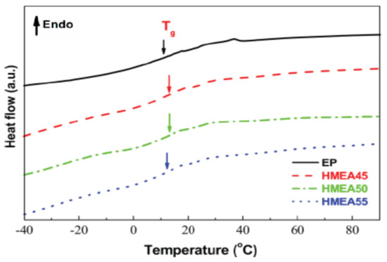 The glass transition temperature (Tg) plays a significant role in the complex low-temperature behavior of materials [35]. Figure 5 shows the glass transition temperature (Tg) of completely cured high-performance cold-mix resin and high-performance cold-mix resin asphalts. It can be intuitively seen that the specific heat capacity (ΔCP) of high-performance cold-mix resin and high-performance cold-mix resin asphalts exhibit a sudden change between −20 °C and 40 °C and the corresponding glass transition temperature are both about 12.4 °C. The low glass transition temperature indicates that high-performance cold-mix resin and high-performance cold-mix resin asphalts in low temperature conditions exhibit good deformation capacity. Generally, the glass transition temperature of pure asphalt is about −20 °C, which indicates that pure asphalt shows good viscoelasticity.