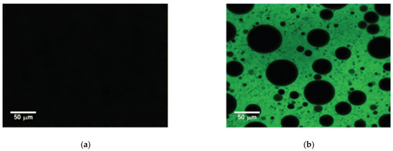 Figure 6 shows the SEM images of cross-sections through high-performance cold-mix resin. The phase-separated structure can be clearly seen from the brittle section of materials, which confers a beneficial toughness to the materials. Figure 7 shows the microscopic appearance of asphalt and high-performance cold-mix resin asphalts observed from LSCM. Under the irradiation of blue laser, the asphalt sample did not emit light and exhibited a black state, whereas the high-performance cold-mix resin in resin asphalt mixtures reflected fluorescence [36]. The resin asphalt mixtures contain two phases, one phase is high-performance cold-mix resin that forms the network structure skeleton, which is the main carrier for resin asphalt mixtures to exert strength; the other phase is pure asphalt distributed in the form of tiny particles in the network structure formed by high-performance cold-mix resin, which plays a role of filling and anti-corrosion. Due to the combined effect of the above two phases, high-performance cold-mix resin asphalts show good deformation capacity and toughness.