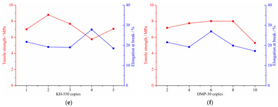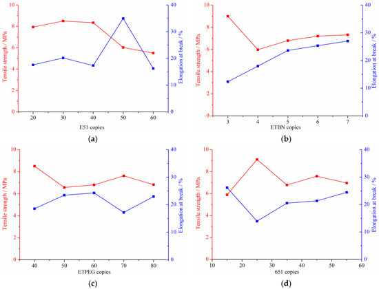 The tensile strength as well as the elongation at break of high-performance cold-mix resin versus the content of respective component are depicted in Figure 8. With the increasing additive dosage of E51 epoxy resin, 651 polyamide curing agent and DMP-30 accelerator, the tensile strength of high-performance cold-mix resin first increases and then decreases. It is worth noting in Figure 8b,c that the addition of a small amount of flexibilizers ETBN and ETPEG can decrease the tensile strength of high-performance cold-mix resin, whereas with the increase of dosage, the tensile strength gradually increases. The KH-550 coupling agent exerts complex influences on the tensile strength and there is no obvious trend therein, but an extreme value is seen.