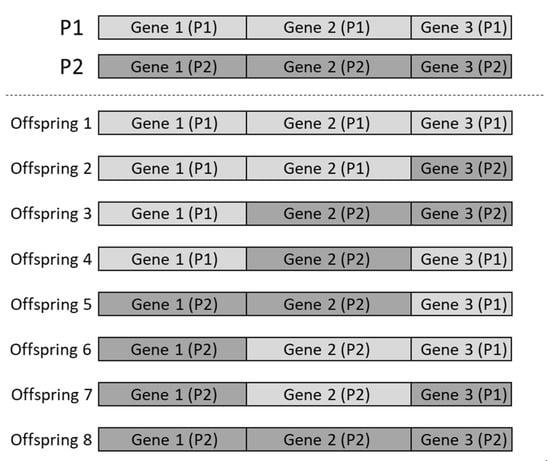 The member is also called the chromosome, which is made up of many genes. The gene is constructed by many base-pairs (bps) [12]. Given a pair of parent chromosomes with genes, the crossover operator will generate different offsprings by the recombination of the genes that are from the parent [13]. To cover the genetic representation ultimately, the whole offsprings are forming to the next generation without any possibility. As illustrated in Figure 1, there is one pair of parents with three genes. Eight () offsprings are generated by the recombination of the parents’ gene, which is the definition of the crossover operator.