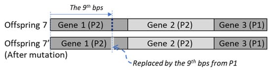 The mutation operator [13] is used to make changes in the genes of a member of the current generation to produce a new member. The mutation occurs at the bps level and is controlled by the mutation rate [12]. When the mutation is invoked at certain bps, the representation bps will be replaced by the opposite parent bps. For example, as illustrated in Figure 1 and Figure 2, the 9th bps of the first gene of offspring 7 will mutate, and the original bps will be replaced by the 9th bps of the first gene of parent 1 (P1).