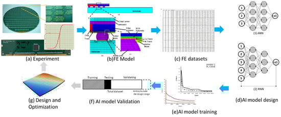 Due to the limited resources, only limited actual samples with very few design parameter combinations are made for the experiments. The FE modeling method is applied to expand the design domain. Based on the experimental results (Figure 3a), a FE model (Figure 3b) can be established and validated. The validated FE model then can be parameterized, and the FE datasets (Figure 3c) can be obtained. However, the specified design parameter combination might induce bad aspect ratios of the elements, which cause the instability of the FE analysis results. The NN model is expected to broaden the design domain. The NN will be carefully designed (Figure 3d) based on the characteristics of the FE dataset and supervised trained (Figure 3e). Moreover, the AI model training’s accuracy requirement(s) should be carefully defined based on the FE dataset. The datapairs that have not been included in the training procedure will be applied to validate the NN model. The validated NN model can be used for design and optimization (Figure 3f). When the new experimental result is available (Figure 3g), the whole procedure can be relaunched.