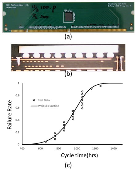 Thermal cycling results: (a) the test board, (b) the Weibull plot, (c) Weibull solder fatigue failure experimental result of 21 samples.