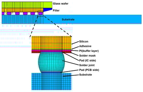 Finite element model for conventional WLCSP and proposed glass WLCSP.