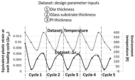 Figure 10 schematically illustrates the characteristics of the datapairs. There are three design parameter inputs, including the die, glass, and PI thickness. Since the FE model is under five thermal cycle loadings, denoted as the cycle 1–5 illustrated in Figure 10. At each cyclic thermal loading, there is an equivalent plastic strain () with respect to each temperature.