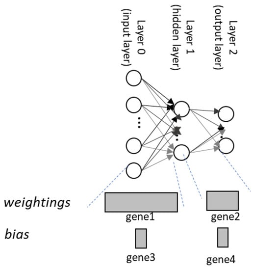 In neural network-based AI modeling, the initial parameters are required to launch the machine learning process. This initial parameter is usually chosen randomly in the literature. In this paper, a GA is proposed to achieve the best initial parameter for the AI modeling. The GA chromosome is defined as the combination of genes. Each gene is the combination of the weightings or bias between two layers [12]. For instance, if there are two layers with and neurons, the gene occupies individuals as illustrated in Figure 11. Each individual in the gene is defined as a base-pair (bps). The chromosome is a combination of genes from various layers.