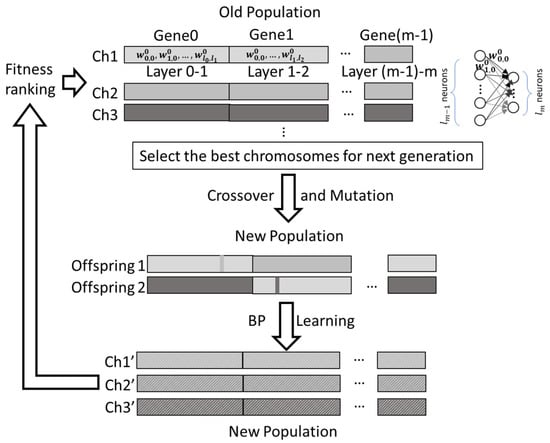 The GA optimization procedure is illustrated in Figure 12. Each GA step starts with the old population of many chromosomes (Ch). The fitness ranking by Equation (1) limits that only the best chrmosomes can enter the next population. By the crossover and mutation operators, a new population can be generated. The backpropagation of NN learning provides new fitness rankings for the next GA step.
