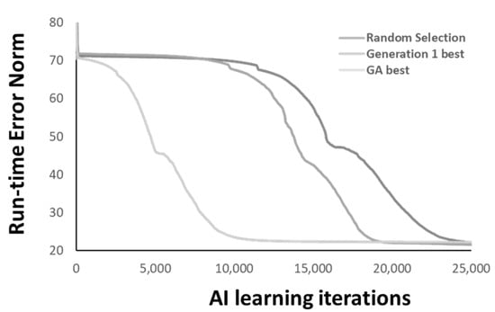 When the RNN architecture is applied with the “back-to-original” GA optimizer, Figure 13 shows convergence curves among random select chromosomes from the 2000 members (random selection), the best chromosome from the first generation (generation 1 best), and the best one from the whole GA optimization (GA best). A clear contribution of the GA optimization to the convergence speed can be confirmed.