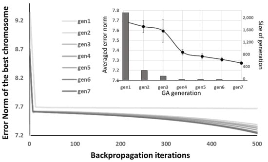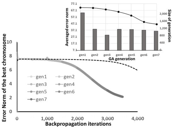 The converging behavior of the “progressing” GA optimization demonstrates much difference from the “back-to-original” one. As illustrated in Figure 17, which is the performance of the GA generations under the “progressing” optimizer under an ANN architecture. It clearly depicts the evolving of the chromosomes moving along the backpropagation process. The dashed line of Figure 17 is the convergence curve of the randomly selected 2000 initial GA generation. Comparing the dashes curve to the solid ones, one can identify the continuous optimizing characteristics of the “progressing” GA. The inset of Figure 17 shows the average error norm and size of the generation with respect to the GA generation. Although a continuous convergence of the average error norm can be found, the size of the generation is larger than the “back-to-original” one. This is because the backpropagation algorithm provides various gene combinations with few duplications for the next generation, which might increase the optimization capability of GA with considerable computation resources.