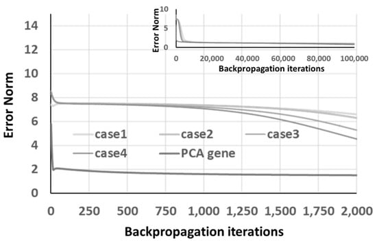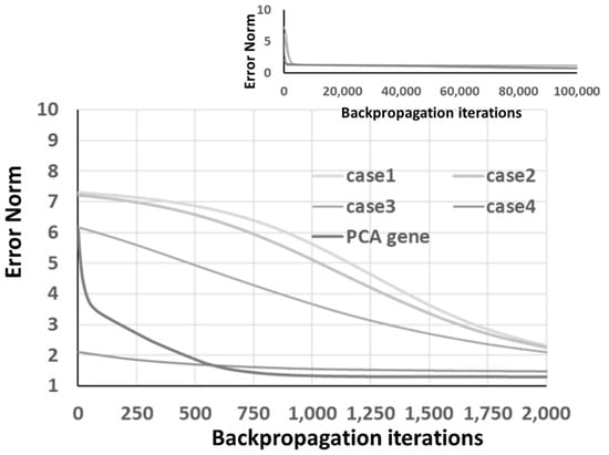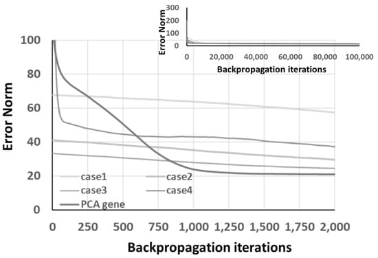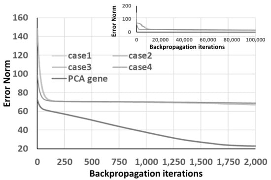 Figure 18 shows the convergence of the four cases and the PCA gene obtained by the same method mentioned above. Although case 4 reveals a low run-time error at the beginning of the learning process, the PCA gene still performs well after approximately 750 learning cycles.
