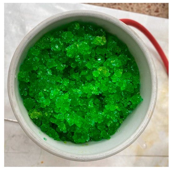 The pickling water was heated to 130 °C in a pre-heater before entering a 500 mm long Vigreux column at the same temperature. The pickling water inlet flowed into the column was 3 L/h. In the column, the pickling water was split into two streams: a vapour stream that condenses in a condenser at 65 °C and a liquor enriched in Fe2+ (188 ± 8.6 g/L). The vapour leaving the Vigreux column was split into two streams in the condenser. A concentrated acid stream (107.7 ± 21.8 g/L) and a water stream, which was treated in a condenser at 6 °C to obtain a water stream without free acid. The whole system was kept under a vacuum of −640 mbar. The enriched liquor was crystallized in a crystallizer at 130 °C and was filtered to obtain a mass of crystallized ferrous chloride and a residual solution that was recirculated at the beginning of the process. The final obtained crystals were washed twice in order to eliminate the acid that could potentially remain on the surface of the crystals. Finally, the crystals were vacuum dried at 60 °C for 12 h. Figure 1 shows the ferrous chloride crystals immediately after crystallization and filtration. The concentrated acid and water could be reused in the pickling process.