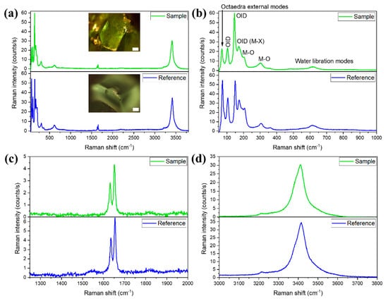 Micro-Raman spectra recorded on the CFC sample (blue) and the FFC sample (green). The excitation wavelength is 633 nm. (a) Spectra showing all of the Raman peaks obtained. In the inset, optical images of both reference and obtained crystals are shown. (b) Raman modes appearing in the low-frequency range (50–1000 cm−1). (c) Intermediate frequency range (1250–2000 cm−1). (d) High-frequency range (3000–3800 cm−1). In all cases, the scale bar is 100 μm.