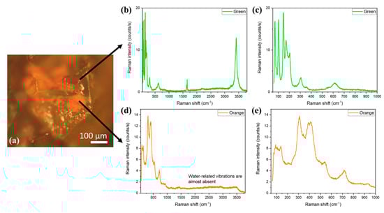 As it has been already mentioned, as the colour of the samples changes from green to orange-brown, the aspect of the crystals in the optical microscope images changes (see Figure 2c,d). There are two different regions that are observed in the AFC crystals: the region that still has a green colour and the orange region (Figure 8a). We have used micro-Raman measurements to study the differences between the green and the orange regions. The spectra recorded on the green part of the crystal (Figure 8b,c) reveal that it is still FeCl2·4H2O, as it exhibits the same modes as those described in Figure 7. The main difference is the signal intensity, which is lower in the aged samples. This can be related to a decrease in the crystal quality.