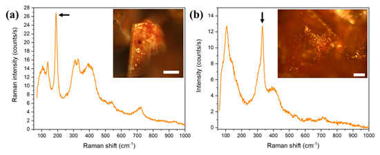 Micro-Raman spectra recorded on AAFC sample: (a) showing the peak related to FeCl3; (b) showing the peak adscribed to akaganeite phase with Cl. Insets: optical micrographs of the crystals where the spectra were taken. In all cases, the scale bar is 100 μm.