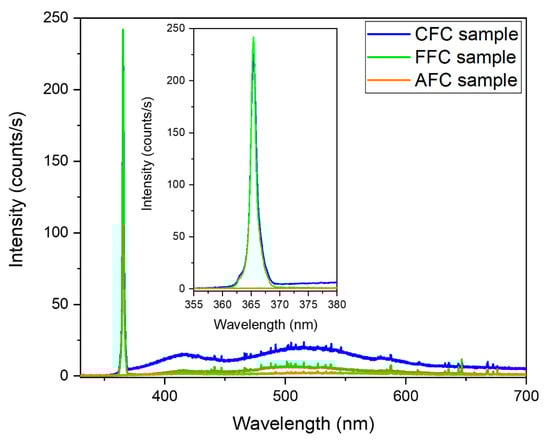 PL emission of CFC sample, FFC sample, and AFC sample (orange region) recorded using a 325 nm laser excitation wavelength. In the inset, a zoom of the peak at 365 nm is shown.
