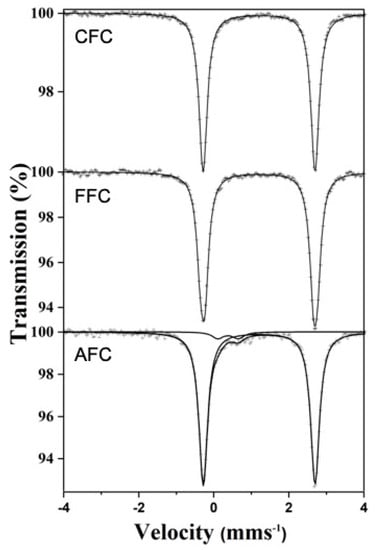 57Fe Mössbauer data were recorded at 298 K in the transmission mode using a conventional constant acceleration spectrometer and a 57Co(Rh) source. An effective absorber thickness of approximately 5 mg·cm−2 of natural iron was used in all of the cases. The velocity scale was calibrated using a 6 µm thick iron foil. The isomer shifts were referred to the centroid of the spectrum of α-Fe at room temperature. All the spectra were computer-fitted using Lorentzian lines.