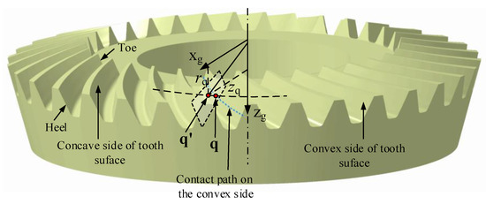 where , , are the coordinates of the tooth surface in . Once both unknowns and are calculated according to Equation (1), the contact point on the contact path is obtained by submitting into the tooth surface .