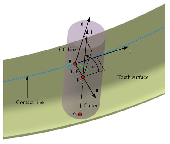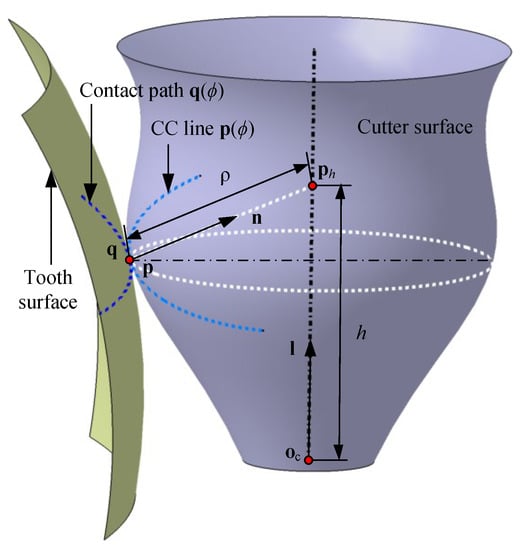 As shown in Figure 2, a process is considered to generate a cutter envelope surface tangent to the tooth surface along the contact path. At each instant of the process, the cutter surface is tangent to the tooth surface at a point, which is represented on both surfaces as and , respectively. The trajectories of the tangent point on both surfaces are cutter contact (CC) line and contact path , respectively. Once contributes as a point on the cutter envelope surface, it means the cutter envelope surface is also tangent to the designed surface at . The necessary conditions of the cutter envelope surface tangent with the tooth surface along are summarized in terms of two aspects [53].