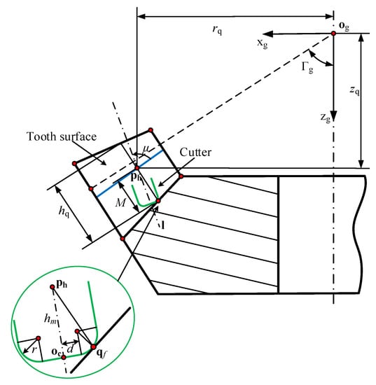 where r is the fillet radius of cutter and d is the cutter constant. When the toroidal surface is tangent to the root cone, can be approximately regarded as h in Equation (3). Therefore, h in Equation (3) can be replaced by in Equation (4) to obtain the coordinates of tip point .