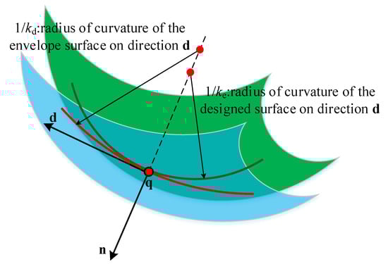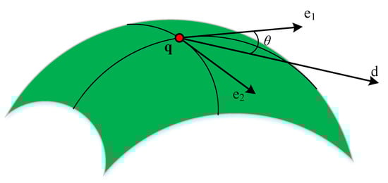 where L, M, and N are the first fundamental homogeneous coefficients, and E, F, and G are the second fundamental homogeneous coefficients. and are the principal curvature and the principal direction at q, respectively. Suppose that the angle between the tangent direction d and the principal direction at point q is , as shown in Figure 5. Then, according to Euler formula, the normal curvature of point q along the tangent direction d is