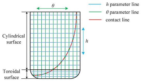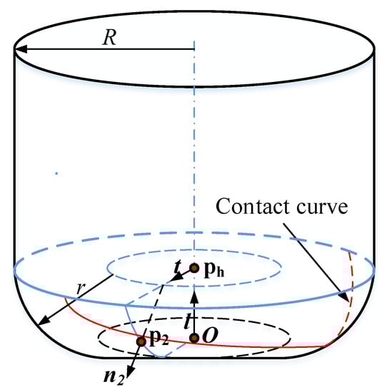 By substituting Equation (17) into Equation (13), corresponding contact points can be calculated. By sampling parameter with all directions on the plane orthogonal to the tool axis , the contact curve on the toroidal part can be obtained.