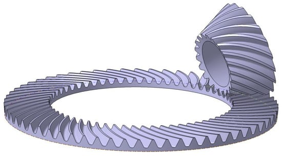 The 3D model of an SBG with 33 teeth is shown in Figure 1. Each tooth slot has both a convex side and a concave side. The depth of the tooth slot gradually decreases from heel to toe. Here we assume that the tooth surface is a given designed surface and represented as . The details of the tooth surface model can be referred to as [2,53].