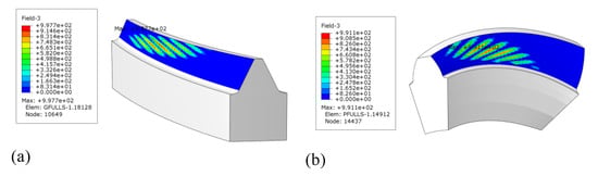 According to the data in Table 1, combined with the tool path planning method and closed-form modeling method proposed in this paper, the optimization model is established according to Equation (9). For this model, the range of is chosen as , and . With the optimal result, the machined surface is calculated according to Equations (10) and (11) and modeled in CATIA V5R20, as shown in Figure 9. The 3D model was imported into ABAQUS to establish the FEM. The material properties are Young’s modulus 206,800 and Poisson’s ratio 0.3. Using the five tooth calculation model, both the gear and the pinion contain 131,600 elements, and the element type is solid element C3D8R. Checking the mesh quality indicates that both the error mesh and the warning mesh are 0. The torque is 2625 N·m, which is applied to the gear. Set the number of CPU cores to 30. After submitting the job, the analysis lasted for 6 h 20 min, and the analysis results are shown in Figure 10. There is a slight edge contact between the gear and the pinion, but the overall contact area is basically in the tooth direction.