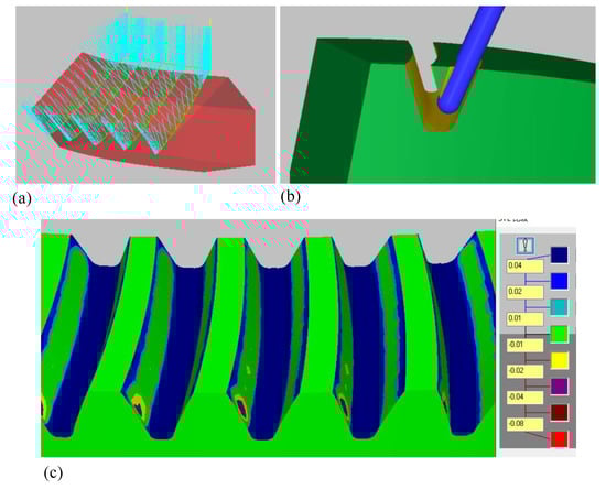 In the experiment, five slots were machined, the calculated tool path was imported into CATIA, and the reasonable advance and retreat tool path was set. Finally, the complete tool path of this experiment was obtained. The simulation processing was verified in Mastercam, as shown in Figure 11a,b. Finally, the five tooth slots model of SBG was obtained and compared with the theoretical tooth surface, as shown in Figure 11c.