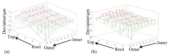 The tooth profile errors of the machined tooth surface were measured by CMM (coordinate measuring machine). According to Gleason’s standard, 5 × 9 grid points are planned on the gear shaft section, and the tooth profile errors are calculated with the grid midpoint as the reference point, as shown in Figure 13. According to the tooth surface equation of SBG, the theoretical coordinates and normal vector of 5 × 9 grid points can be easily obtained. After the theoretical data are input into the CMM, the machine will automatically touch the tooth surface to obtain the actual measured coordinate values , and the tooth profile errors can be calculated according to Equation (18).