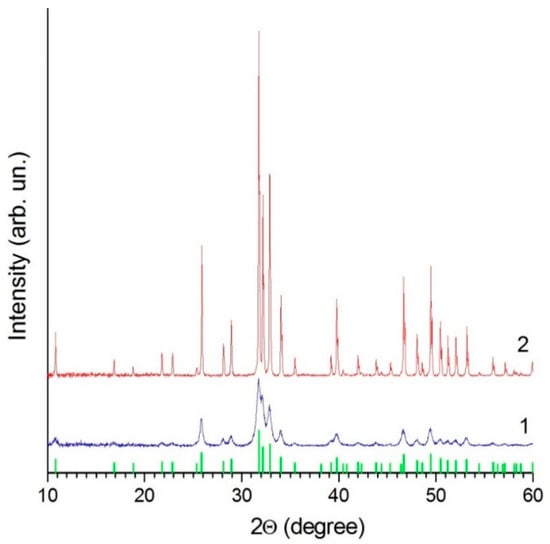 XRD patterns of nano-HA (1) and calc-HA (2) powders. The bar chart corresponds to PDF file 40-11-9308 (ICDD PDF-4) of crystalline HA.