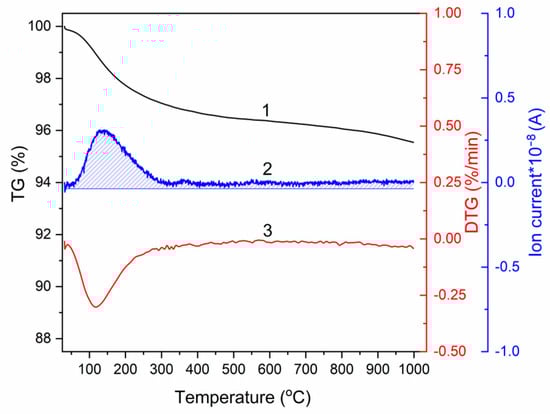 Thermal analysis of nano-HA: 1—thermogravimetry (TG); 2—mass spectrum indicating water release; 3—differential thermogravimetric curve (DTG).