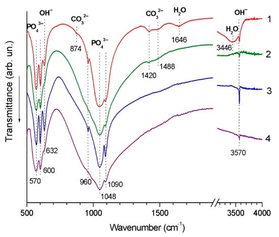 FTIR spectra of nano-HA powder (1), detonation coating obtained from nano-HA powder (2), calc-HA powder (3), detonation coating obtained from calc-HA powder (4).