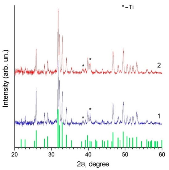XRD patterns of the titanium alloy mesh with detonation coatings obtained from nano-HA (1) and calc-HA (2). Bar chart corresponds to PDF file 40-11-9308 (ICDD PDF-4) of crystalline HA.